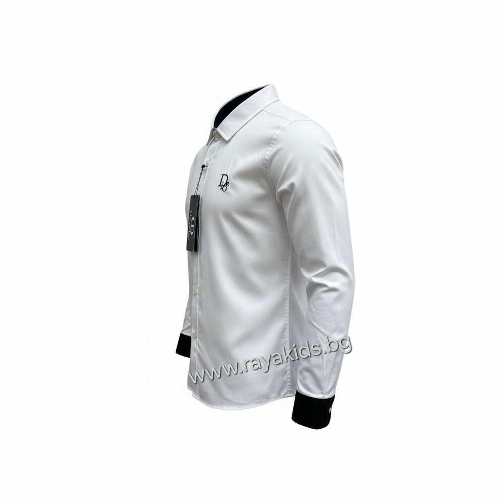 Детска спортно-елегантна риза, подходяща за всички сезони. Стандартна дължина и кройка, закопчаване с копчета и емблема с бродерия. Ризата има възможност за навиване на ръкава. Можете да я комбинирате както с официален панталон така и с дънки.