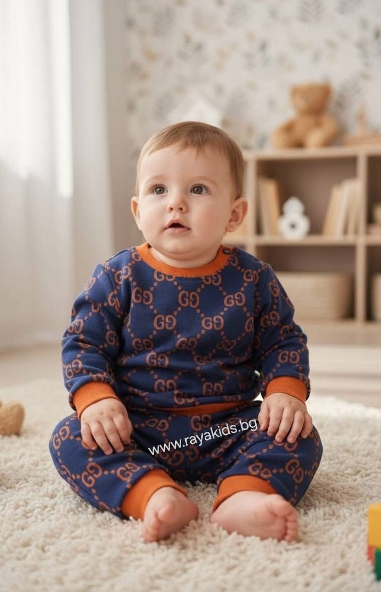 Стилен бебешки комплект, включващ блуза с дълъг ръкав и панталонки с мек ластичен колан. Изработен от 100% висококачествен дишащ памук, в син цвят и оранжев монограмен принт. Осигурява комфорт и свобода на движение – идеален за ежедневие и специални поводи.