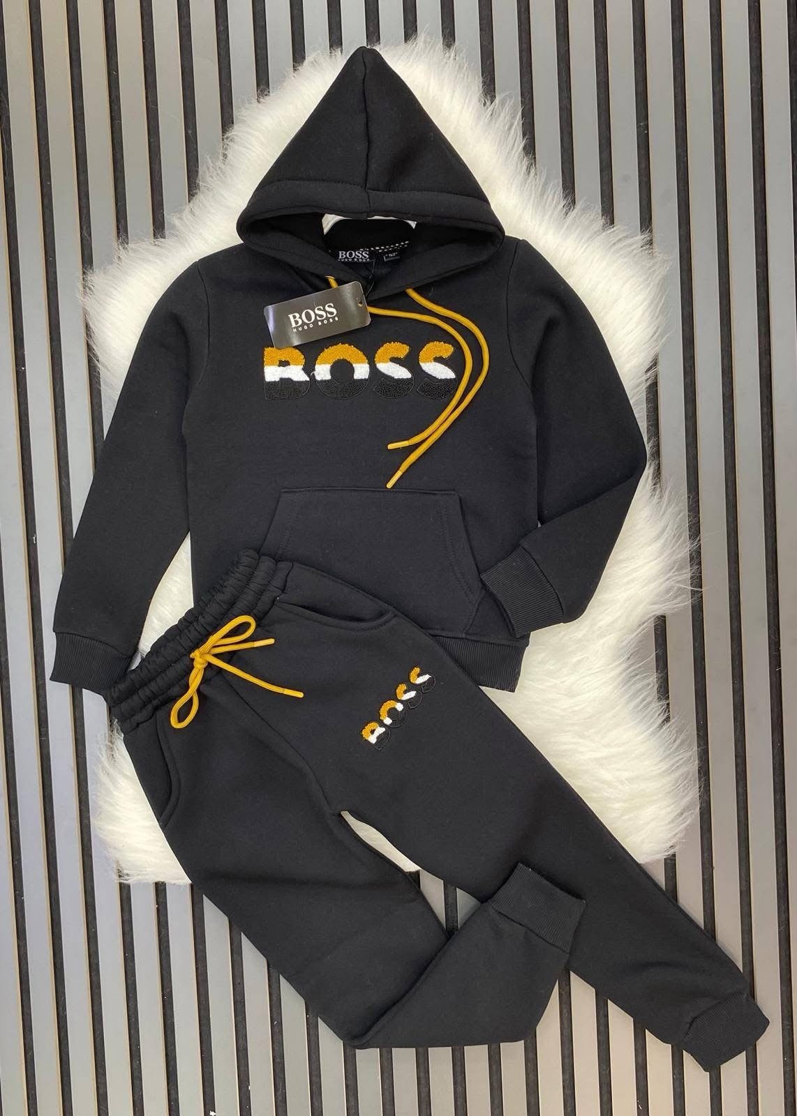 Спортно ватиран екип за момче, изработен от мек и топъл памучен плат с вътрешна вата. Комплектът включва суичър с качулка и преден джоб, долнище с ластичен колан и връзки за регулиране. Идеален избор за ежедневие, спорт и разходки. Подходящ за сезон есен-зима.