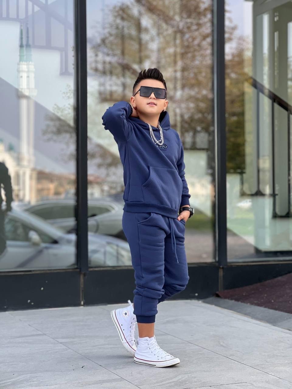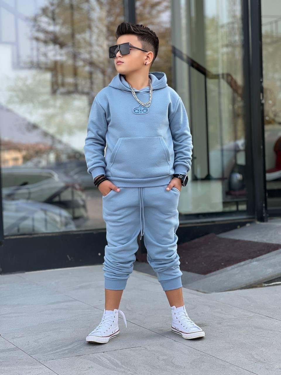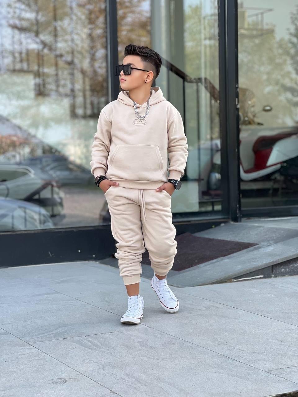 Спортен ватиран екип за момче, изработен от мек и топъл памучен плат с вътрешна вата. Комплектът включва суичър с качулка и преден джоб, долнище с ластичен колан и връзки за регулиране. Идеален избор за ежедневие, спорт и разходки. Подходящ за сезон есен-зима.