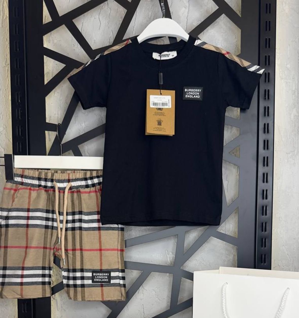Детски комплект за момче BRB от 2 части, с тениска и къси панталони. Висококачествена памучна материя, удобна и комфортна за ежедневни разходки и специални поводи. Тениската е с ефектна кожена емблема и нашивка на раменете, с класиюеското каре на бранда. Късите панталони са с ластична талия и връзки за регулиране на ширината, джобове отпред и ефектна кожена емблема.