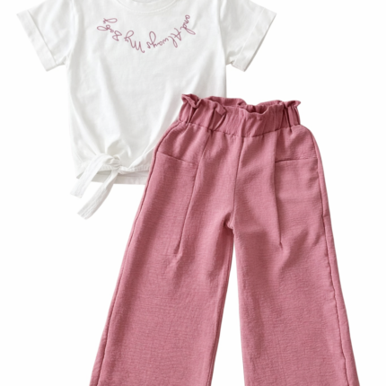 Детски комплект за момиче от 2 части. Висококачествена материя, удобна и комфортна за ежедневни разходки и специални поводи. Тениската е украсена с блестящи камъни и бродирано лого. Полата е с ластичен колан, декориран с лого на бранда.