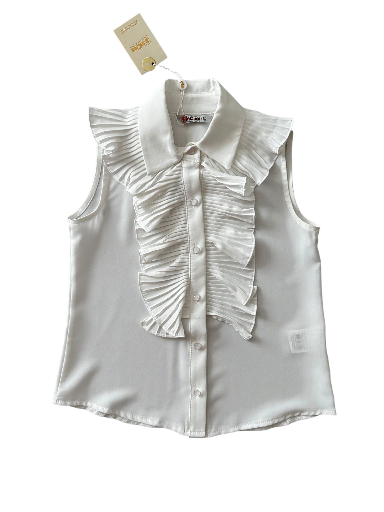 Придайте елегантност на детския гардероб, с тази стилна бяла блуза без ръкави. Моделът се отличава с красиви декоративни волани и плисета отпред, изработени от фино плисиран плат. Идеален избор за официални събития, празници или стилни ежедневни визии. Комбинирайте с пола, панталон или дънки за завършен външен вид.