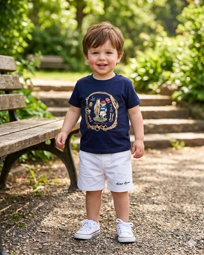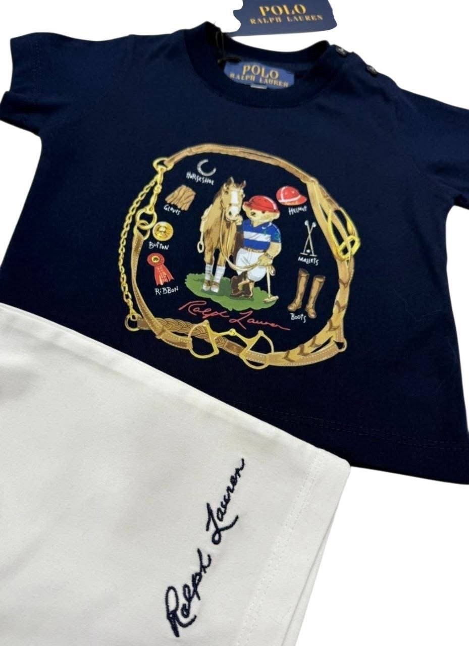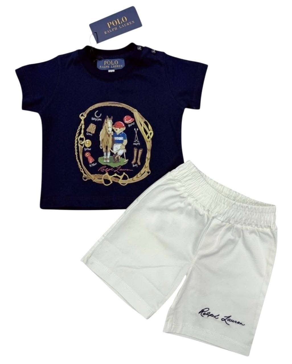 Стилен бебешки комплект впечатляващ с модерна визия и усещане за лукс. Тъмносинята тениска е акцентът в модела, с атрактивен и детайлен принт, който придава индивидуалност и игрив характер, а късите панталони в светъл цвят създават свеж контраст и завършена, елегантна визия. Комплектът е изработен от висококачествен, мек и дишащ 100% памук, който е изключително нежен към чувствителната бебешка кожа и осигуряват комфорт дори при целодневно носене. Ластичната талия на панталонките гарантира удобно прилягане и лесно обличане, а свободната кройка позволява пълна свобода на движение – идеално за активните малчугани.