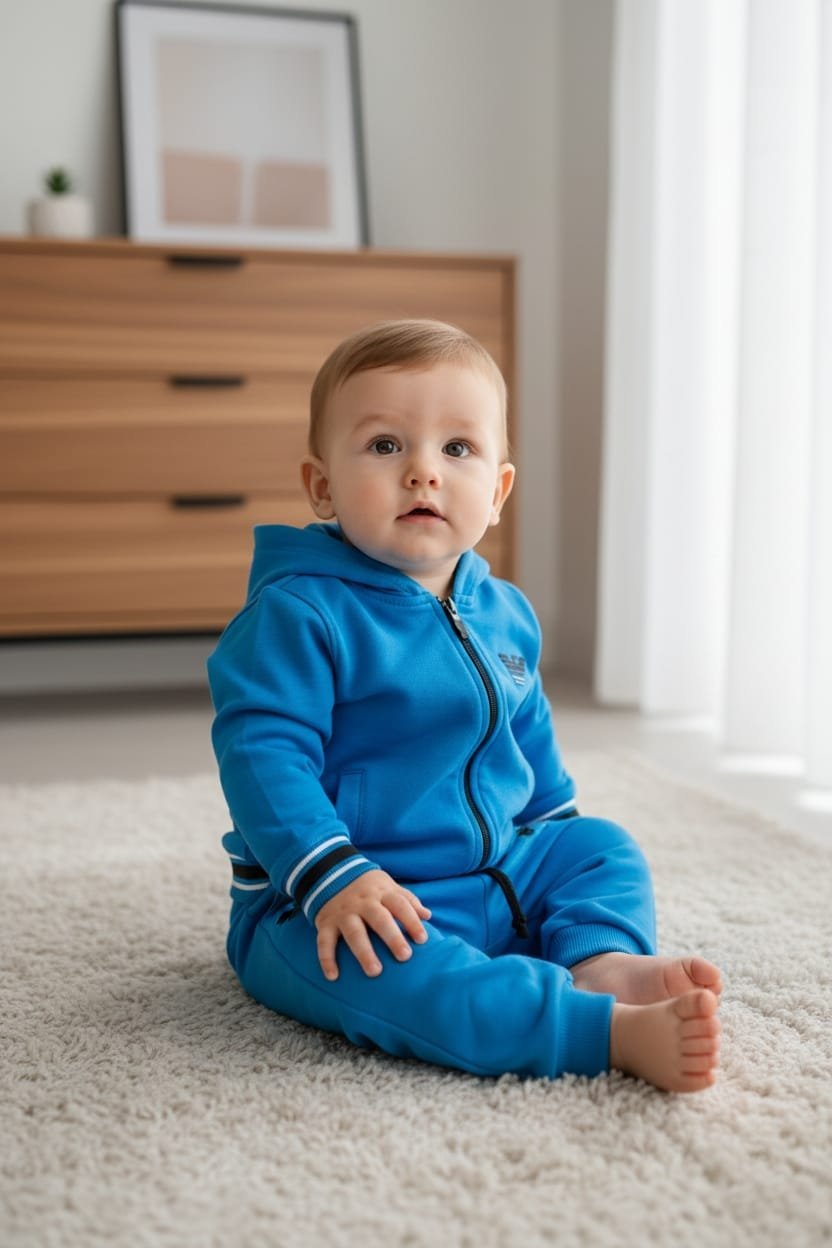Моделът включва горнище с качулка, която осигурява допълнителна защита и уют, както и удобно долнище, създадено да не ограничава движенията на бебето. Фин детайл е деликатното бродирано лого, което придава стилен и завършен вид, без да дразни кожата.