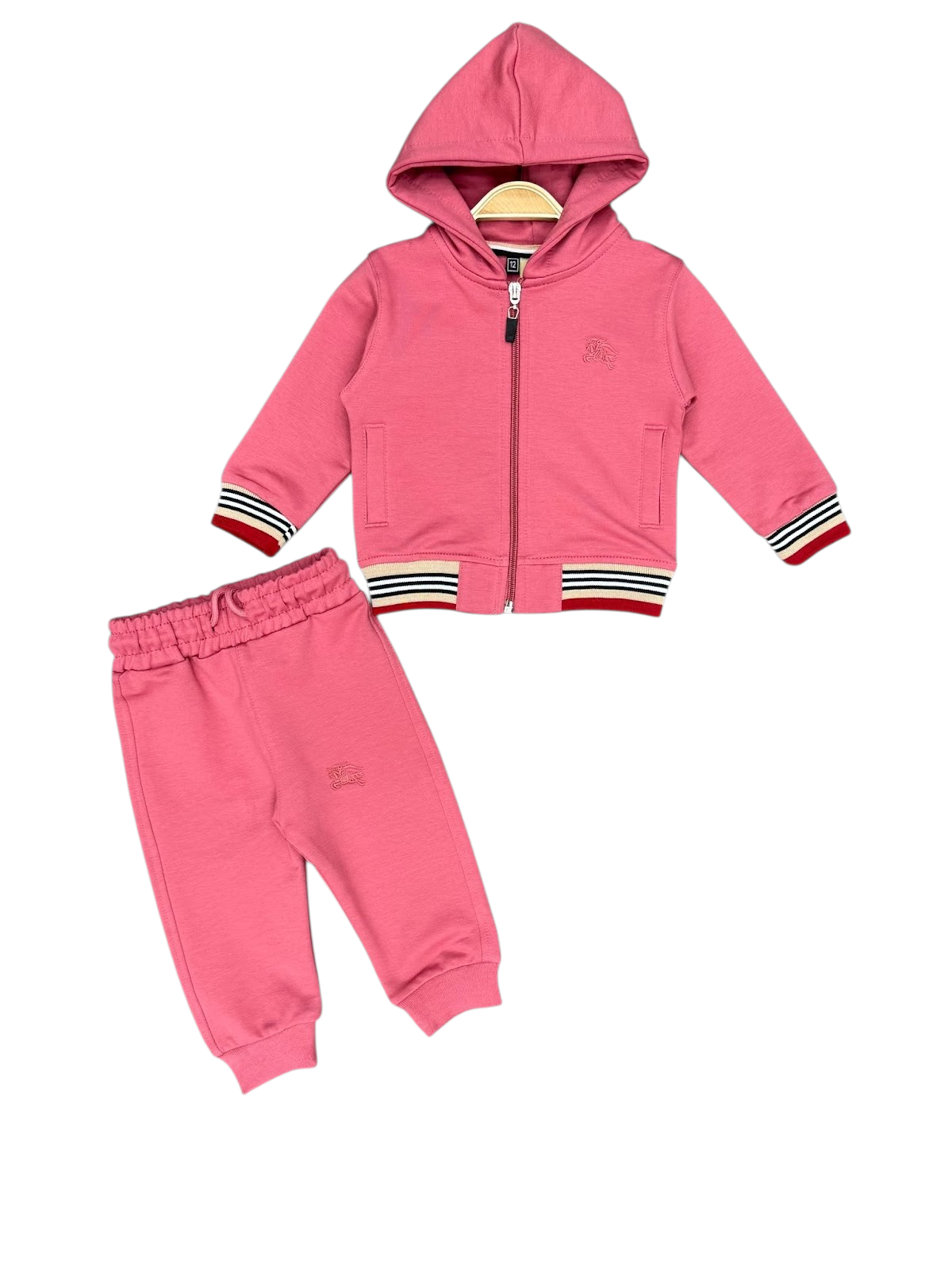 Моделът включва горнище с качулка, която осигурява допълнителна защита и уют, както и удобно долнище, създадено да не ограничава движенията на бебето. Фин детайл е деликатното бродирано лого, което придава стилен и завършен вид, без да дразни кожата.