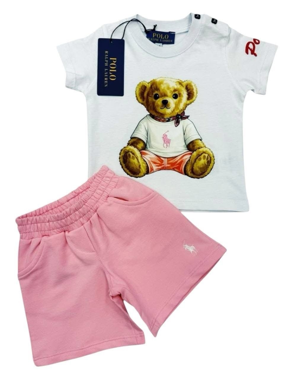 Очарователен бебешки комплект с нежната визия и усещане за лукс, създаден за малките дами със стил. Комбинацията от бяла тениска с фин принт и логото на бранда, заедно с розовите къси панталонки, придава свежа и модерна визия.