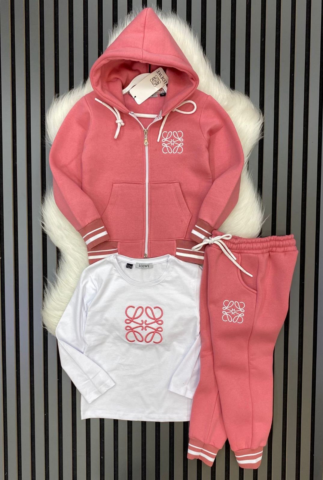 Модерен и удобен ватиран екип за момиче, състоящ се от три части – суитшърт с цип и качулка, блуза с дълъг ръкав и долнище. Изработен от висококачествена памучна материя, с вътрешна вата, подходящ за зимата. Подходящ за ежедневие, училище, разходки и спорт.