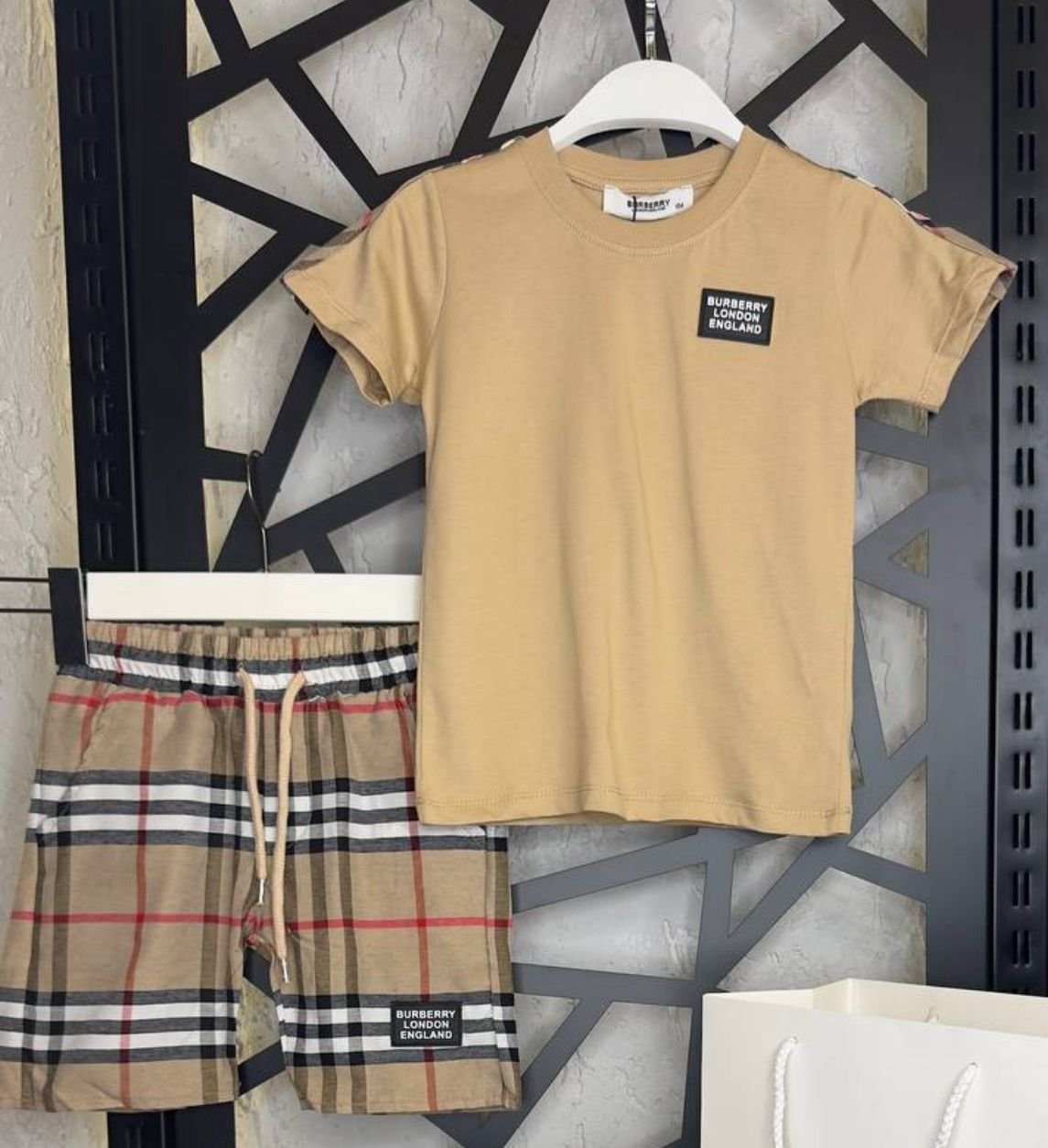 Детски комплект за момче BRB от 2 части, с тениска и къси панталони. Висококачествена памучна материя, удобна и комфортна за ежедневни разходки и специални поводи. Тениската е с ефектна кожена емблема и нашивка на раменете, с класиюеското каре на бранда. Късите панталони са с ластична талия и връзки за регулиране на ширината, джобове отпред и ефектна кожена емблема.