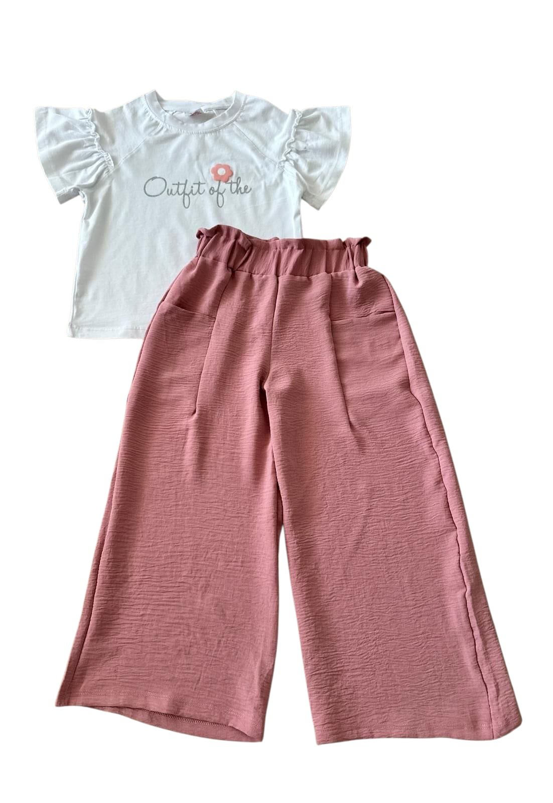 Стилен и удобен комплект, състоящ се от дълъг панталон и блуза с къс ръкав. Блузата е изработена от мека и дишаща памучна материя, с красива апликиция, която придава свеж и игрив вид. Късите ръкави осигуряват комфорт през топлите дни, а свободната кройка позволява свобода на движение. Панталонът е с дължина до глезена, изработен от лека и ефирна материя, с удобен ластик на талията за лесно обличане.