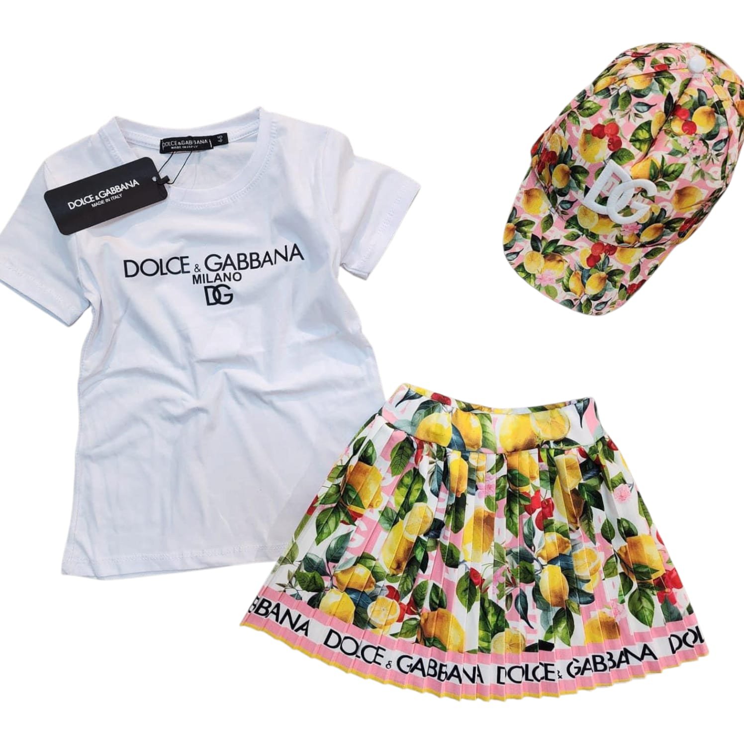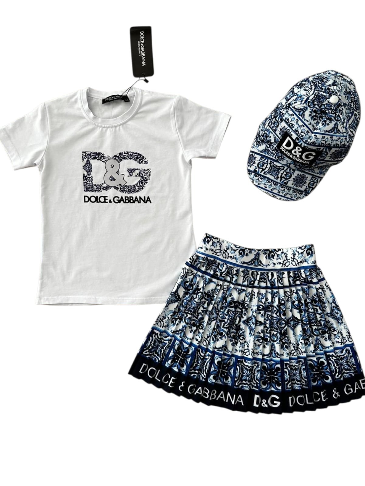 Детски комплект за момиче от 3 части. Висококачествена материя, удобна и комфортна за ежедневни разходки и игри. Тениската е украсена с цветна апликация и логото на марката. Полата е изработена от нежнa и ефирна материя, с принт на емблематичните шарки на бранда.