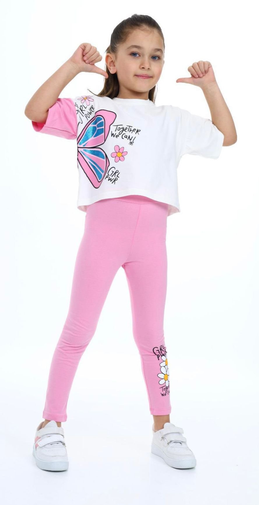 Нежен и удобен детски комплект, подходящ за ежедневието и активните моменти. Състои се от тениска с къс ръкав и клин, които осигуряват свобода на движение и комфорт през целия ден. Комплектът е украсен с красива щампа с пеперуди, която придава свеж и момичешки акцент. Изработен от мека и приятна на допир материя, подходяща за чувствителната детска кожа. Удобната кройка го прави идеален избор за игри, разходки и забавления.