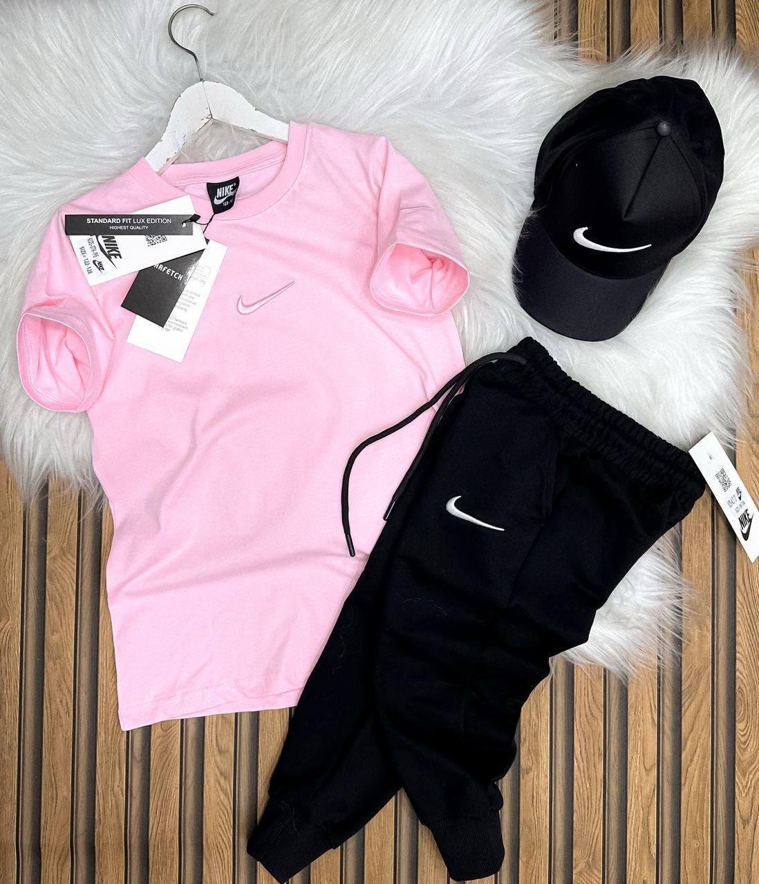 Стилен екип от 3 части, подходящ за ежедневието, разходка или спортни активности. Комплектът включва удобна тениска, дълъг спортен панталон и модерна шапка с козирка, които се комбинират отлично за завършена визия.