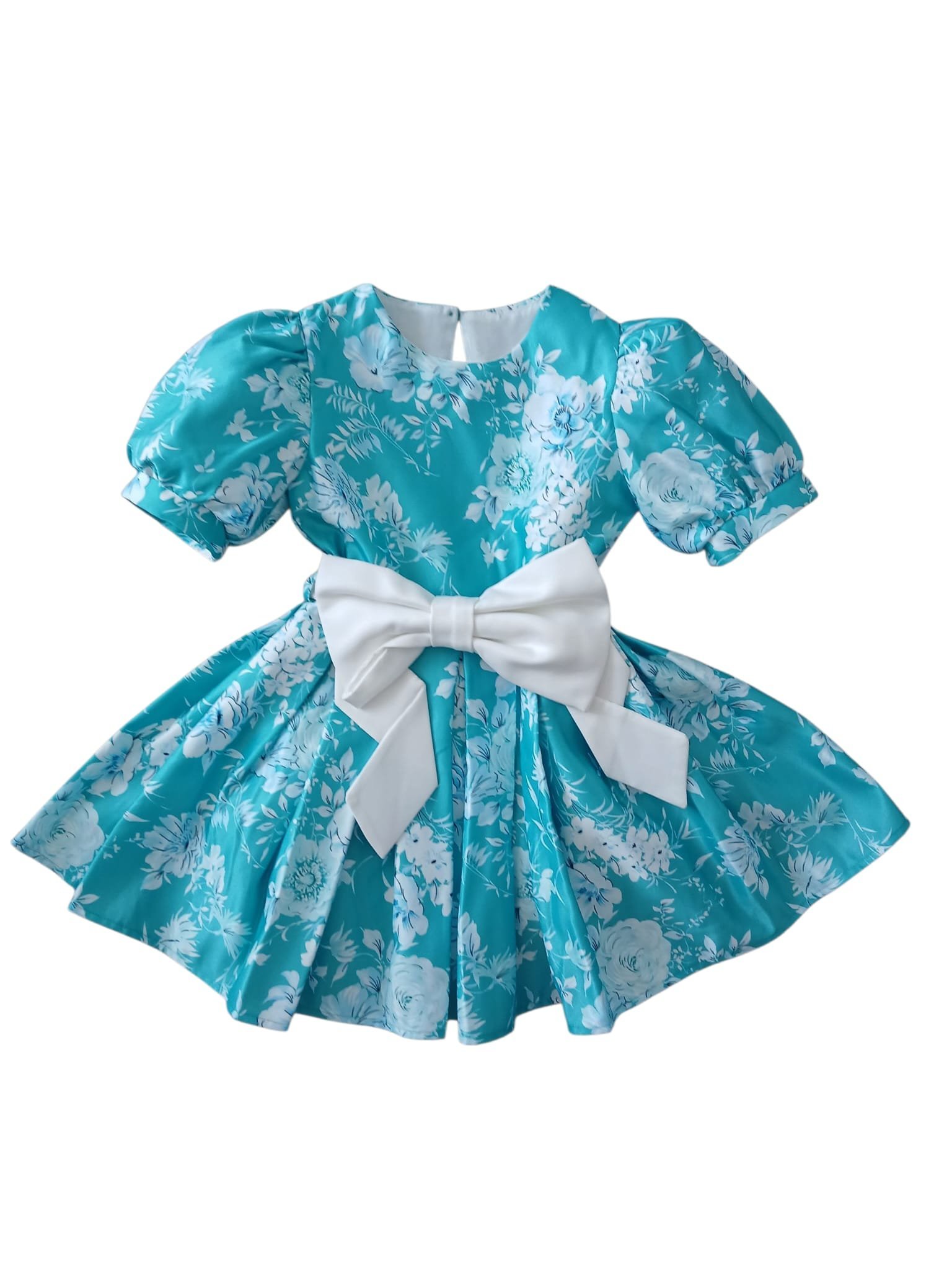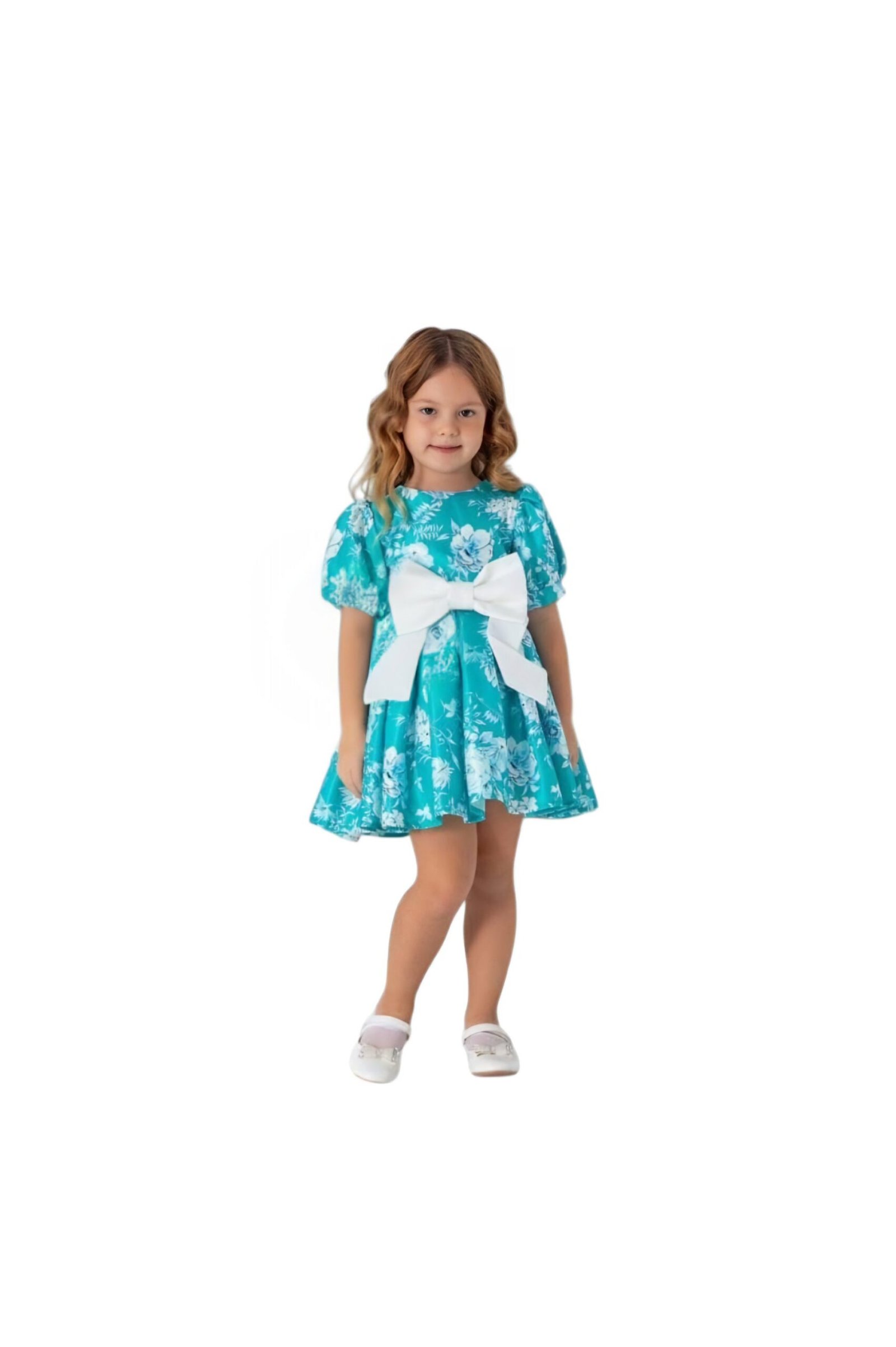 Вземи елегантна детска рокля с къс ръкав, от колекция Пролет-Лято! Рокля с къс буфан ръкав, елегантна панделка на талията и тюл Роклята е изработена висококачествена комфортна материя, подходяща за официални поводи.